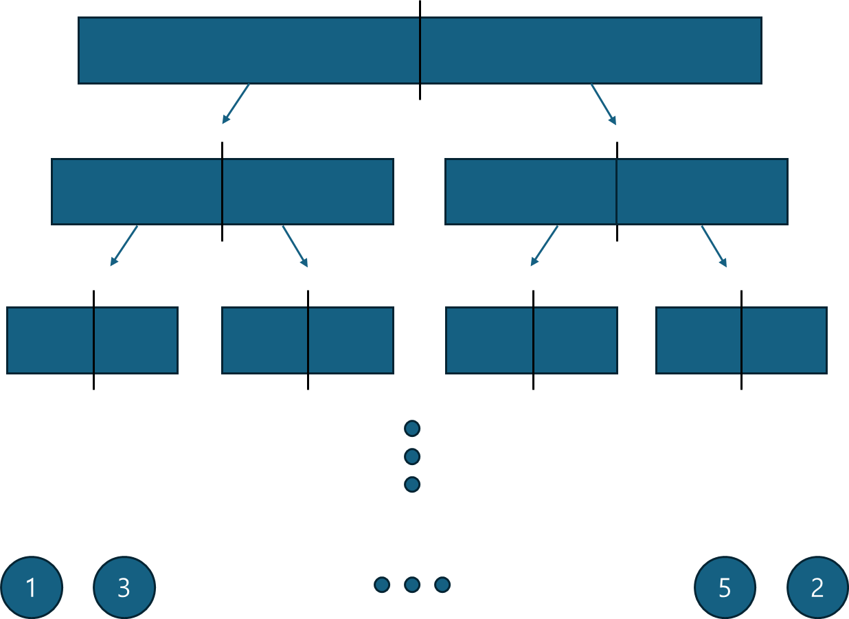 병합 정렬은 문제를 더 작은 문제로 쪼개서 재귀적으로 풀이한다. 대표적인 O(NlogN) 정렬 알고리즘이다.