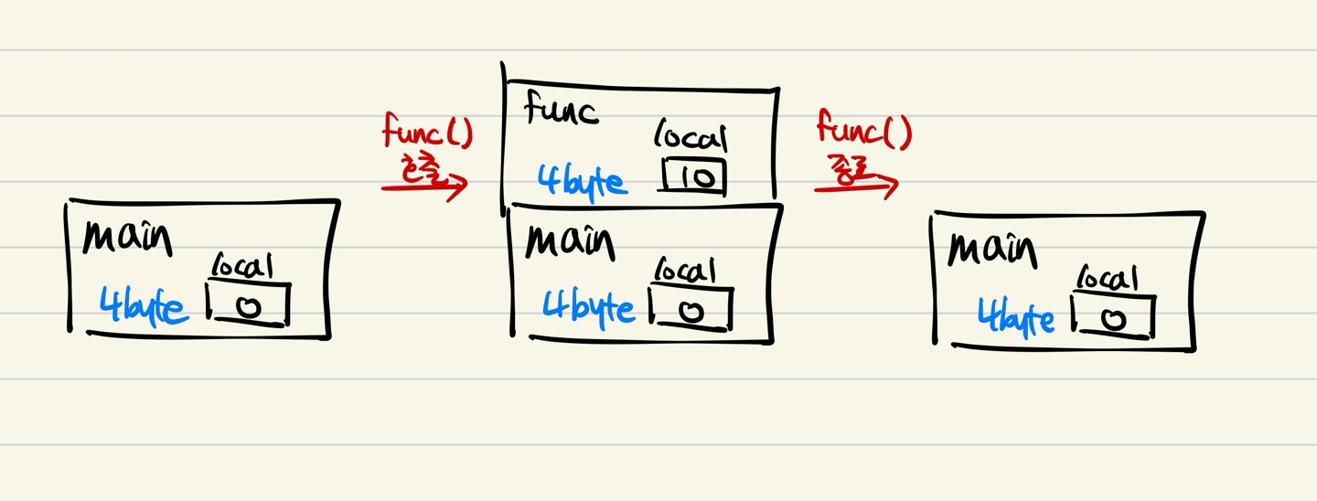 위에 두 가지 함수가 있는데, 각 함수마다 서로 다른 지역이므로 동일한 변수명을 사용할 수 있고, 서로 간에 변수명으로 직접적인 접근은 불가능하다. 위 코드는 main 함수에서 func()을 호출했다가 아무것도 하지 않는 local이라는 변수를 선언했다가 종료된다. 아래에 그 과정을 거치면서 스택 메모리에 생기는 일을 나타낸 것이다. 중요한 것은 스택에 메모리를 할당할 때, 메모리를 얼마나 할당해야 하는 지 알아야 하기 때문에 함수 안에서 사용하는 모든 지역변수의 크기를 컴파일 과정에서 알아야 한다. 그리고 그 결과로 스택영역에 메모리가 적재된다. 위의 경우 각각 함수가 int형 데이터 1개씩을 선언했기 때문에 stack의 크기가 4byte이다. 스택영역에는 오로지 함수에서 사용하는 지역변수만 적재되고, 코드 (명령어)는 코드 영역에 저장된다는 점을 간과하기 쉽다.